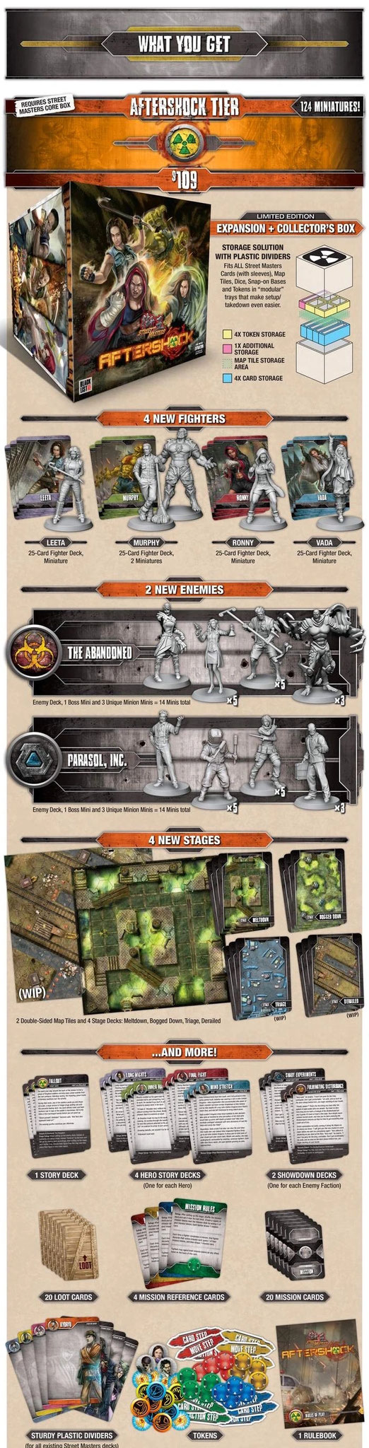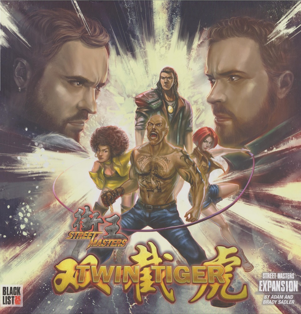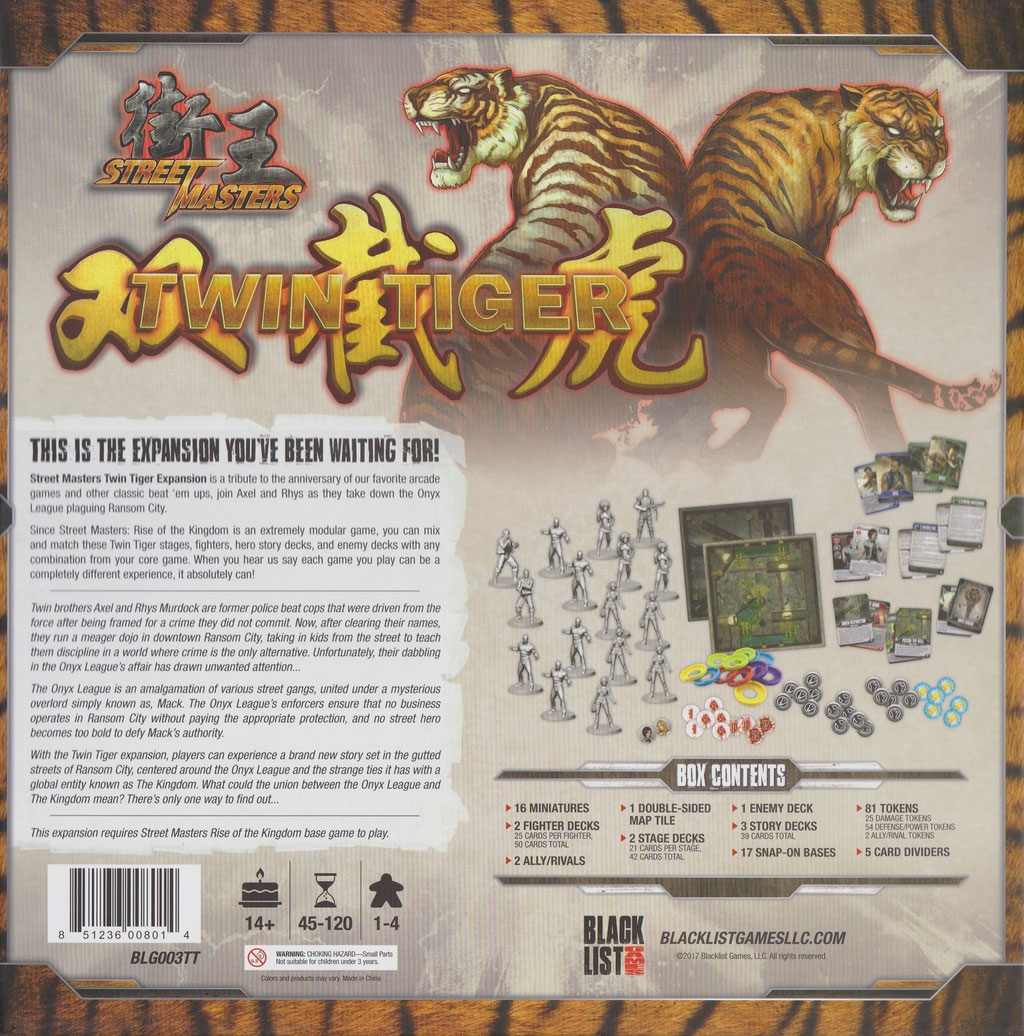 Street Masters Twin Tiger: 16 Miniaturen, 2Kämpferdecks, 2 Verbündete/Rivalen, 1 doppelseitige Spielplanteile, 2 Stage-Decks (gesamt 42Karten), 1 Gegnerdecks, 3 Story-Deck, 5 Kartentrenner, 81 Token, 17 ansteckbare Bases