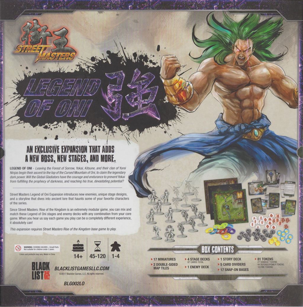 Street Masters Legend of Oni: 17 Miniaturen, 2 doppelseitige Spielplanteile, 4 Stage-Decks (gesamt 87Karten), 1 Gegnerdecks, 1 Story-Deck, 5 Kartentrenner, 81 Token, 17 ansteckbare Bases