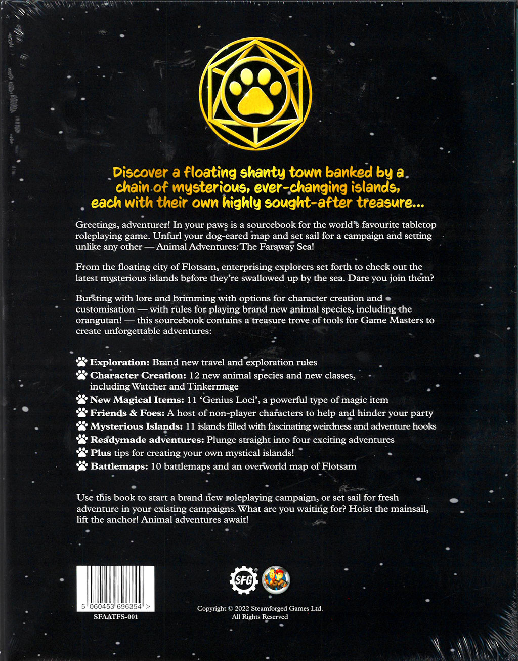 Seid gegrüßt, Abenteurer! In deinen Pfoten hältst du ein Quellenbuch für das beliebteste Rollenspiel der Welt. Entfluse deine Karte mit den Eselsohren und verlasse den Hafen für eine Kampagne und ein Schauplatz, der seinesgleichen sucht – das Ferne Meer! Diese wundersamen Wellen beherbergen einen sich ständig verändernden Archipel, in dem dank mysteriöser magischer Kräfte einzigartige Inseln mit den vergehenden Tagen kommen und gehen. Perfekt für einen unternehmungslustigen Entdecker wie Sie! Rund um das Ferne Meer ist eine seltsame Gemeinschaft entstanden: die schwimmende Stadt Flotsam (Treibgut), ein Paradies für Abenteurer (und Sonderlinge) aller Art. Faszinierende Geheimnisse und unglaubliche Entdeckungen lauern auf zwei oder vier Beinen. Zum Beispiel hatte Flotsam einmal einen Zwilling, Jetsam, der vor einigen Jahren plötzlich spurlos verschwunden ist... Viele exotische Lebewesen nennen das Ferne Meer ihr Zuhause. Spiele auf deinen Reisen als erwachtes Tier aller möglichen Rassen, darunter ein Orang-Utan, ein Seeotter, ein Albatros und mehr! In diesem Buch finden Sie alles, was Sie brauchen, um die Welt von Animal Adventures zu erkunden: