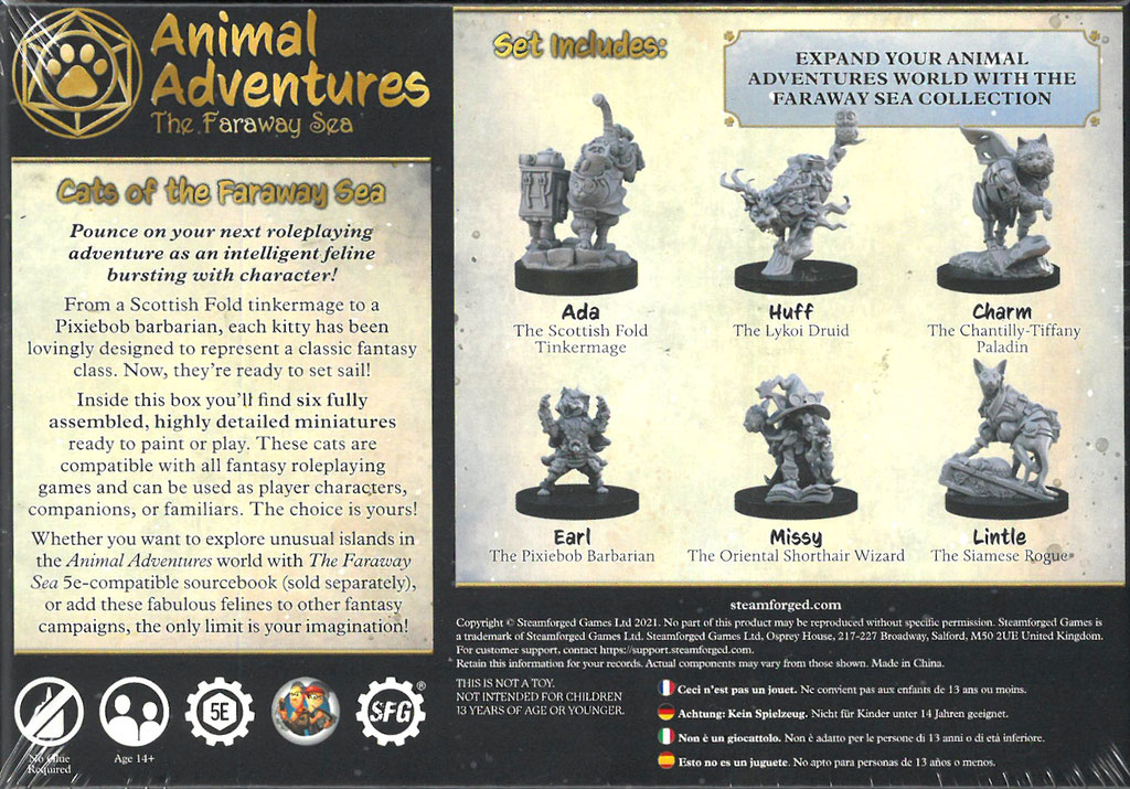 In dieser Box findest du sechs vollständig zusammengebaute, sehr detaillierte Miniaturen, die du bemalen oder spielen kannst. Diese Katzen sind mit allen Fantasy-Rollenspielen kompatibel und können als Spielercharaktere, Begleiter oder Vertraute verwendet werden. Es ist deine Entscheidung! Ganz gleich, ob du mit dem 5e-kompatiblen Quellbuch „The Faraway Sea 5e“ (separat erhältlich) ungewöhnliche Inseln in der Welt der Tierabenteuer erkunden oder diese fähigen Hündchen zu anderen Fantasy-Kampagnen hinzufügen möchten – Deiner Fantasie sind keine Grenzen gesetzt! Erweitere deine Tierische Abenteuerwelt mit der Faraway Sea-Kollektion |