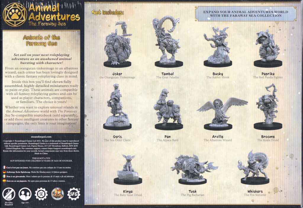 Inhalt: 11 Miniaturen (Joker - The Orangutan Tinkermage, Tambal - The Goat Paladin, Bucky - The Rabbit Monk, Pabrika - The Red Oanda Fighter, Osric - The Sea Otter CLeric, Pan - The Alpaca Bard, Arville - The Albatross Wizard, Broome - The Koala Druid, Kinya - THe Baby Goat Druid, Tusk - The Pig Barbarian, Whiskers - The Fox Sorcerer)