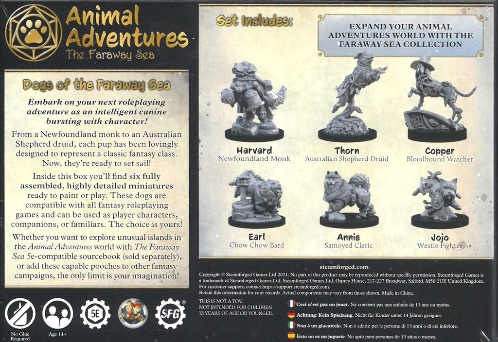 In dieser Box findest du sechs vollständig zusammengebaute, sehr detaillierte Miniaturen, die du bemalen oder spielen kannst. Diese Hunde sind mit allen Fantasy-Rollenspielen kompatibel und können als Spielercharaktere, Begleiter oder Vertraute verwendet werden. Es ist deine Entscheidung! Ganz gleich, ob du mit dem 5e-kompatiblen Quellbuch „The Faraway Sea 5e“ (separat erhältlich) ungewöhnliche Inseln in der Welt der Tierabenteuer erkunden oder diese fähigen Hündchen zu anderen Fantasy-Kampagnen hinzufügen möchten – Deiner Fantasie sind keine Grenzen gesetzt! Erweitere deine Tierische Abenteuerwelt mit der Faraway Sea-Kollektion |