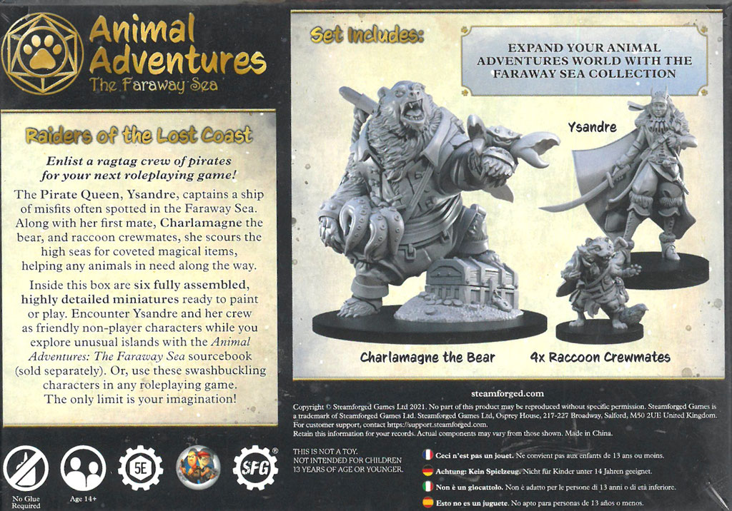In dieser Box befinden sich sechs vollständig zusammengebaute, sehr detaillierte Miniaturen, die zum Bemalen oder Spielen bereit sind. Treffen Sie Ysandre und ihre Crew als freundliche Nicht-Spieler-Charaktere, während Sie mit dem Quellenbuch „Animal Adventures: The Faraway Sea“ (separat erhältlich) ungewöhnliche Inseln erkunden. Oder verwenden Sie diese verwegenen Charaktere in einem beliebigen Rollenspiel. Die einzige Grenze ist Ihre Fantasie! Erweitere deine Tierische Abenteuerwelt mit der Faraway Sea-Kollektion |